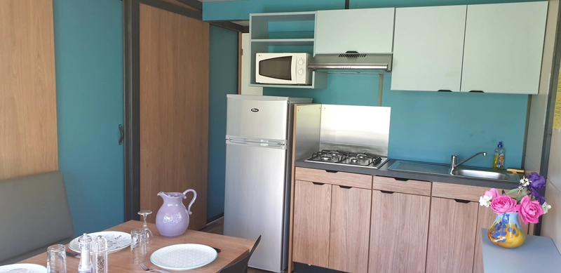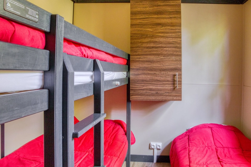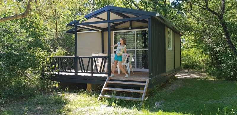 chalet offered by Les Rives de l'Aygues, a campsite near the river in Drôme Provençale. Covering an area of 25 m², this accommodation has two separate bedrooms, the first with a double bed, the second with three single beds, two of which are bunk beds that are sure to delight children. The chalet has an equipped kitchen area, an air conditioning, and a bathroom with a shower. The toilets are separate. To top it off, the chalet has a charming covered terrace to fully enjoy the nature side of the campsite. Animals are accepted, under conditions.